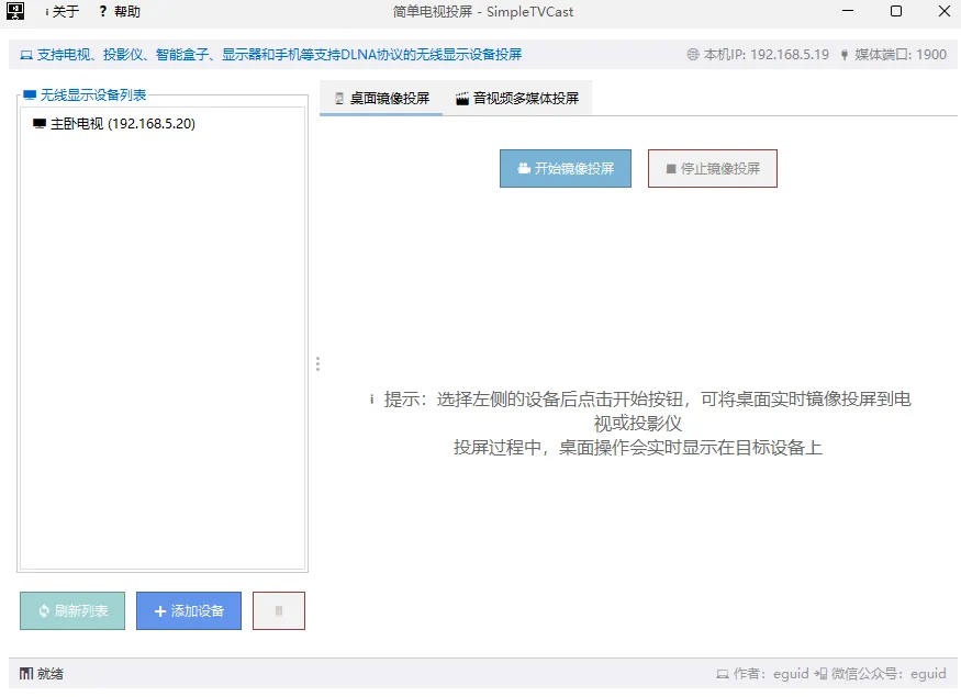 simpleTVCast一款超级简单且强大的Windows无线电视投屏软件,支持电脑桌面镜像投屏和视频文件投屏两种电视投屏方式。