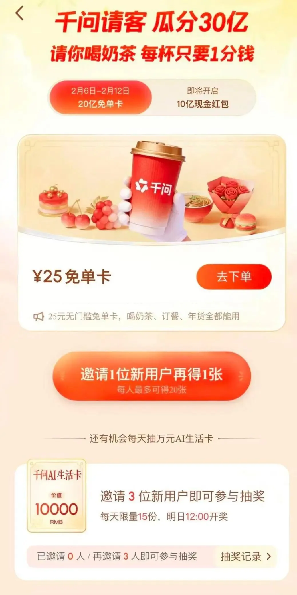 下载或更新App后再邀请一位新朋友,即可再获得一张25元无门槛免单卡,每人最多可得20张。当日累计成功邀请3位新朋友,可获得机会,抽取价值万元的千问AI生活卡。