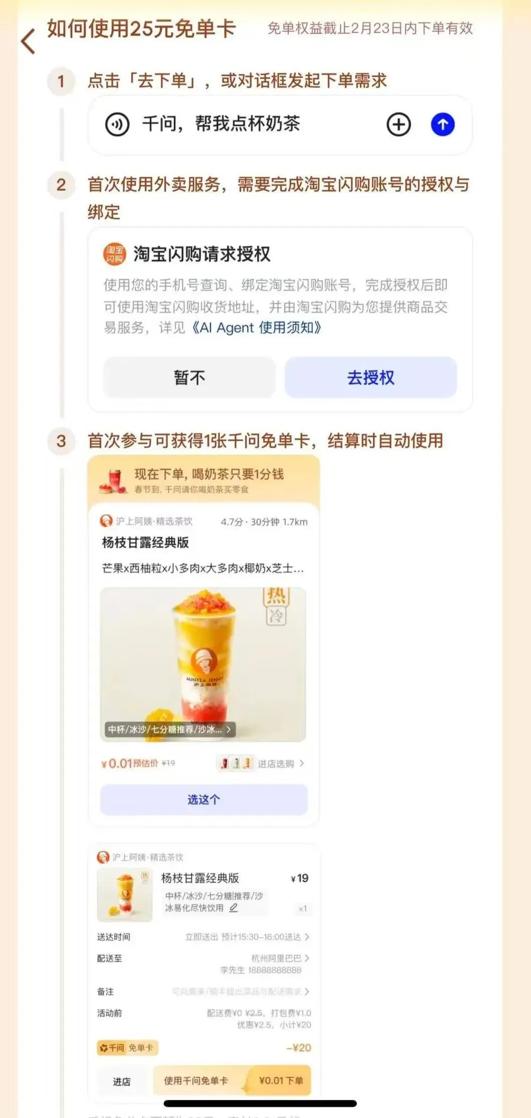 3.首次参与可获得1张千问免单卡,结算时自动使用