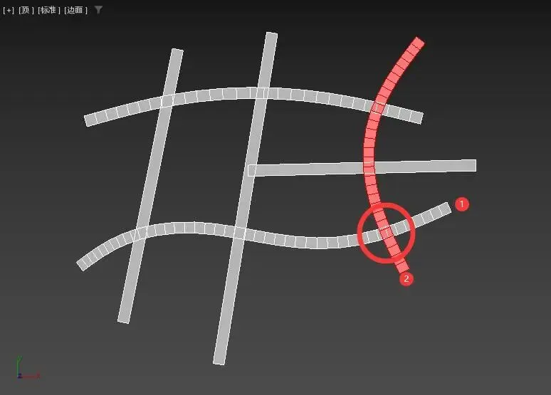 在上图中,道路1和道路2属于同一可编辑多边形对象中的两个“元素”,它们在红圈位置只是重叠,两条道路并未在这里相交形成交叉路口。