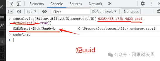 15. 然后再引擎的控制台使用函数进行打印,获取短的uuid。注意有的长uuid会带一个小后缀(形式为a-b-c-d.xxxxx),需要去掉这个xxxxx后缀才能转换成短的。