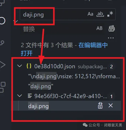 20. 这个就是我们资源对应的数据。众所周知图片资源在CocosCreator3.8里可以出现两个后缀,分别是xxx/texture和xxx/spriteFrame,那么这里的daji就是我们资源的名称,接下来我们搜索这个daji.png看看,来确认一下是否可以搜索到数据。