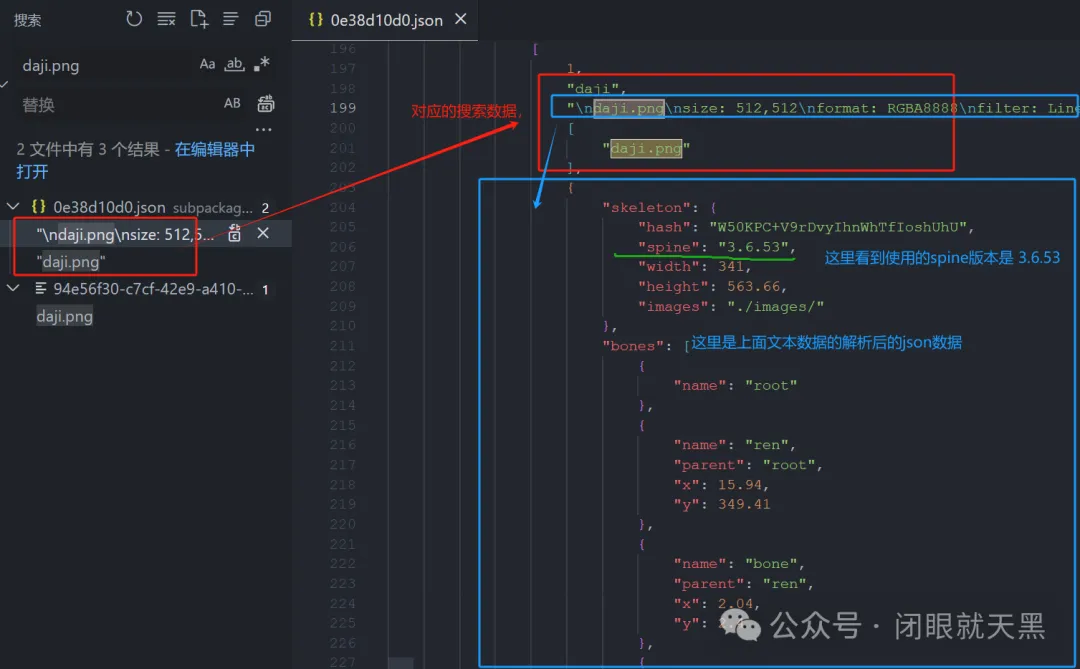 21. 果然可以搜索到了结果,我们具体看一下内容。第1个文件,我们看到了spine动画的文本数据,可以看到spine动画的json数据和图片数据。