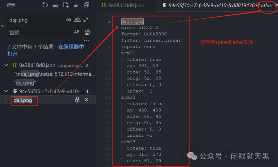 23. 然后我们看另一个搜索结果文件,查看内容,这里就是spine的文件的atlas文件。
