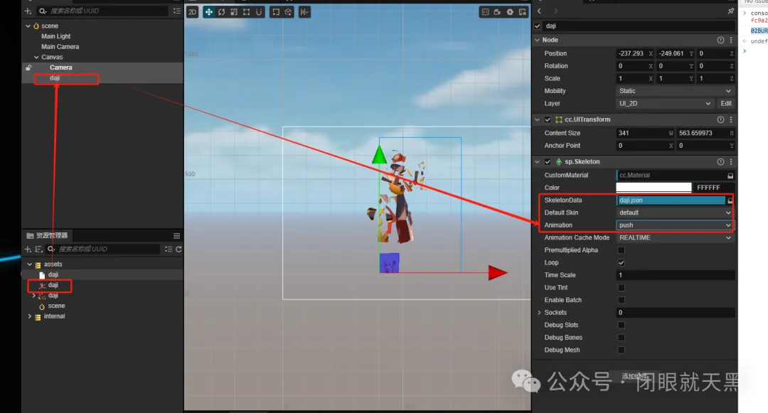 28. 把三个文件放在我们刚新建的项目里测试一下看看效果,首先把三个资源放到资源管理器里,然后拖动scene场景里,然后再节点属性里,给它指定动画数据。