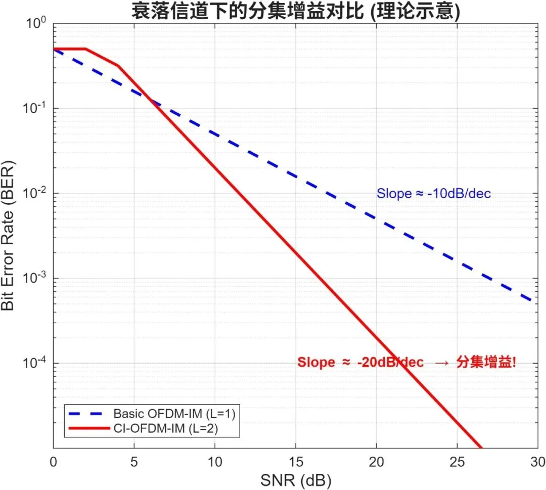 ┌─────────────────────────────────────────────────────────────────┐│ DM-OFDM + CI-OFDM-IM 系统架构 │├─────────────────────────────────────────────────────────────────┤│ ││ 【DM-OFDM 双模式调制】 ││ 索引比特 ──► Mode 1 位置 (高阶 16-QAM) ││ └► Mode 2 位置 (低阶 QPSK) ──► 100% 利用率 ││ ││ 【CI 坐标交织分集】 ││ 复数符号 ──► I 分量保持 ──┐ ││ └► Q 分量置换 ──┴► 分集增益 ×2 ││ ││ ┌────────── 瑞利衰落信道 ──────────┐ ││ │ 深衰落 → CI 保护 → 分集恢复 │ ││ └──────────────────────────────────┘ │└─────────────────────────────────────────────────────────────────┘