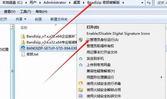 第2步、将下载好的Bnadizip 密钥破解版打开后,右键以管理员身份运行BANDIZIP-SETUP-STD-X64.EXE