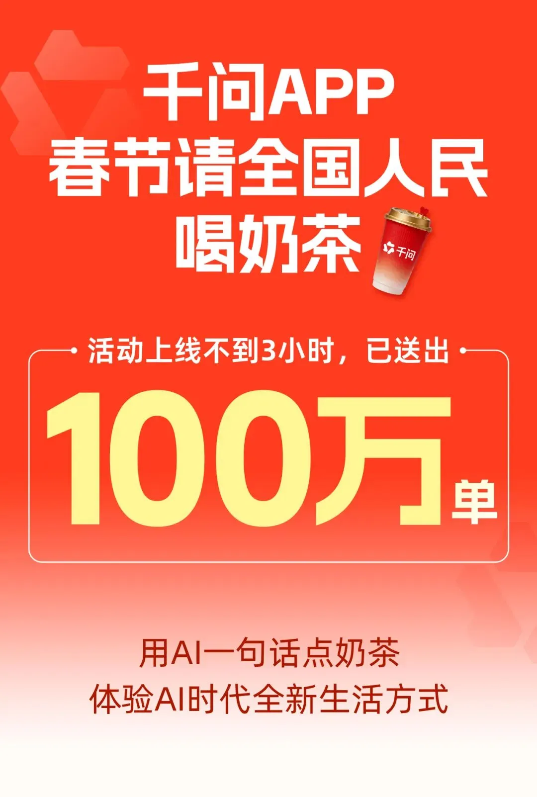 2月6日,阿里千问APP“春节30亿大免单”正式上线,发起奶茶攻势,请全国人民用AI一句话免费点奶茶。用户火爆参与,活动上线不到3小时,用千问APP下单超100万单奶茶。在社交平台上,网友纷纷晒出自己用千问APP下单的“第一杯AI奶茶”。