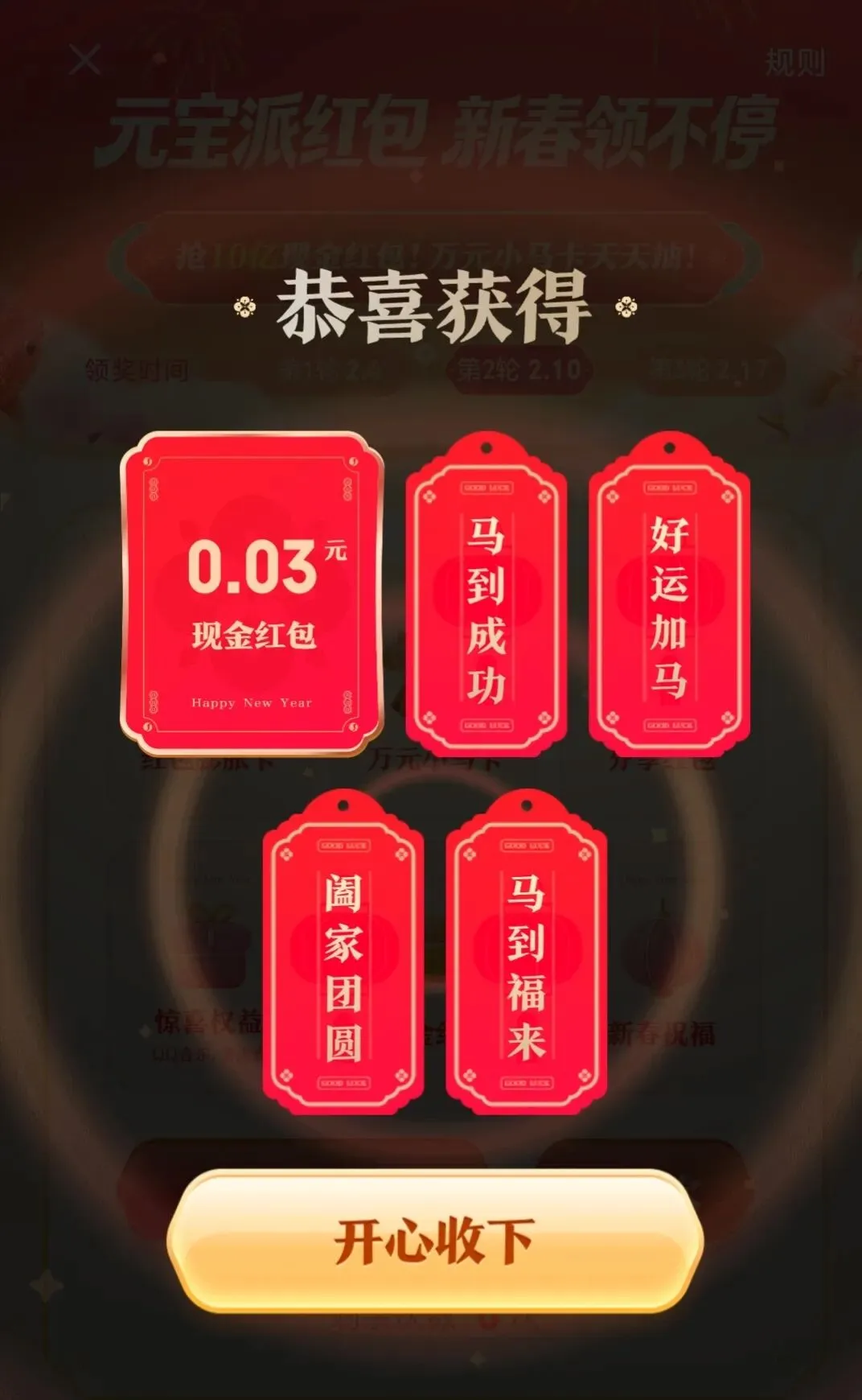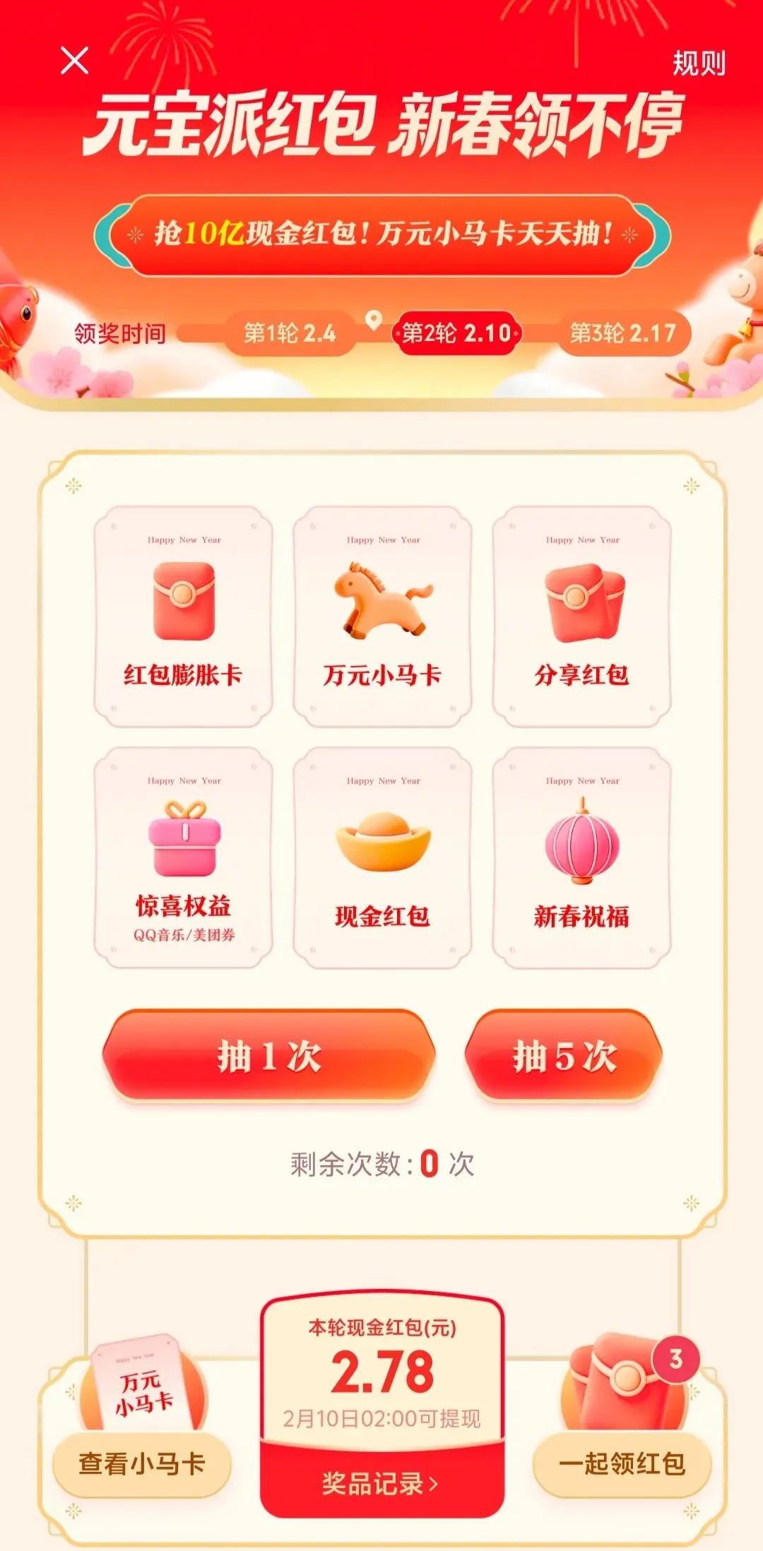 这是我这两天抽的现金红包,2.78元,就等2月10日,看看能不能提现。