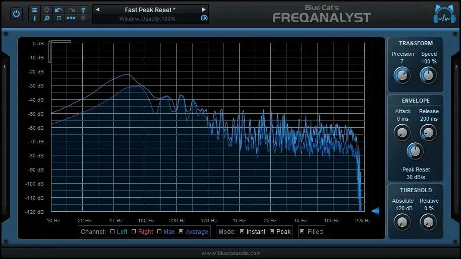 Blue Cat 的 FreqAnalyst 是一款免费的频谱分析仪插件,可让你实时监控音频信号的频谱内容。该插件旨在提供极高的时域和频域平滑度和高分辨率:与大多数频谱分析仪不同,Blue Cat 的 FreqAnalyst 凭借其独特的平滑插值算法,即使在非常高的频率分辨率下也能显示连续变化。音频到频率显示转换的大部分方面都可以进行管理,从而让你完全掌控监控过程。我们开发了一种特殊的阈值系统,帮助你轻松查看频谱中的重要部分。如果你需要在特定频率范围内获得更高的精度,可以缩放显示并查看你感兴趣的图表部分。该插件支持 Blue Cat 的皮肤语言,因此你可以根据个人需求自定义用户界面。如何获取频率分析仪点击下方红色按钮即可访问 Blue Cat Audio 网站点击 FreAnalyst 页面顶部的蓝色“下载”按钮,然后选择适合你系统的安装程序。运行安装程序,将插件安装到你的系统上。Blue Cat Audio 网站: