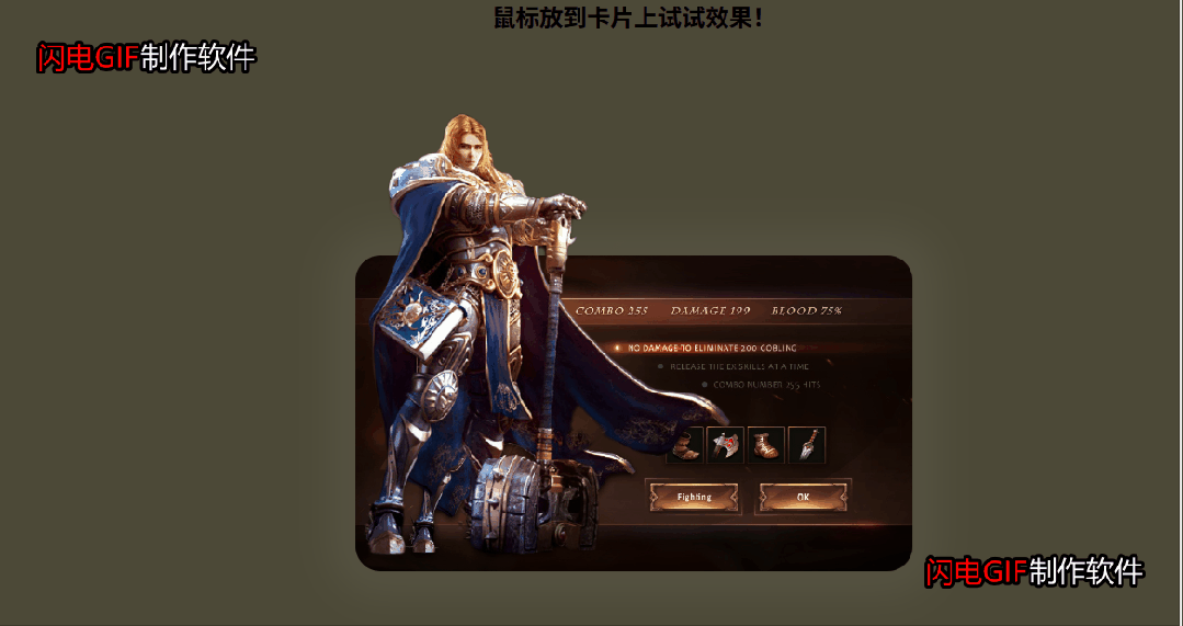 <!DOCTYPE html><htmllang="zh"><head><metacharset="UTF-8"><metahttp-equiv="X-UA-Compatible"content="IE=edge,chrome=1"><metaname="viewport"content="width=device-width, initial-scale=1.0"><title>CSS3立体感3D卡片人物样式</title><linkrel="stylesheet"type="text/css"href="css/normalize.css" /><!--CSS RESET--><linkrel="stylesheet"href="css/main.css"></head><body><divclass="container"><h3style="text-align: center">鼠标放到卡片上试试效果!</h3><divclass="wrap"><divclass="card"><divclass="rolebg"><imgsrc="img/bg.jpg"alt=""></div><divclass="role"><imgsrc="img/role.png"alt=""></div><divclass="content"><h1>NO DAMAGE TO ELIMINATE 200 GOBLINE</h1><p>PlayStation 4 -Xbox</p></div></div></div></div></body></html>