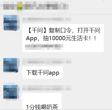 刚刚,有记者发现,千问的红包分享链接也被微信屏蔽,页面显示网页存在诱导或误导下载/跳转的内容,需要跳转第三方浏览器访问。同时,部分用户在千问APP点击分享活动至微信好友时,已自动改为复制口令形式。