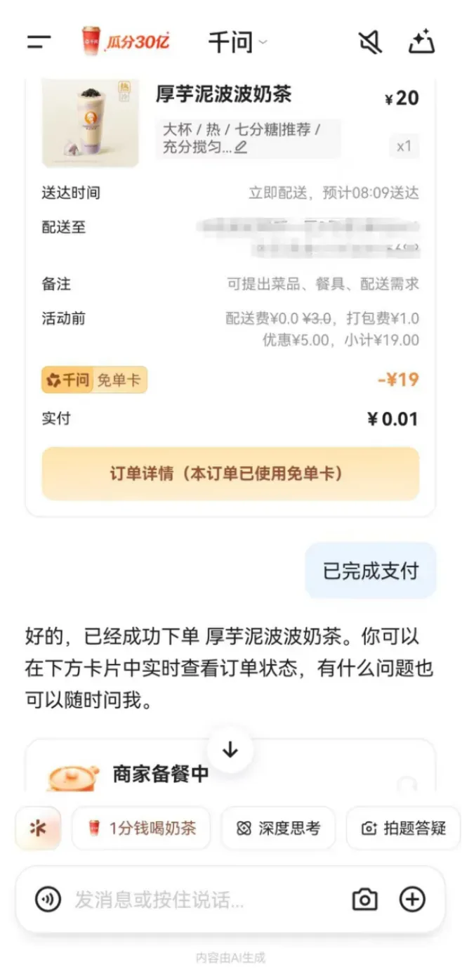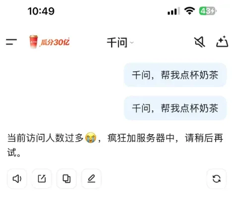 千问APP启动30亿免单,2个多小时100多万人抢,系统挤崩、门店爆单!AI一句话免费点奶茶,每人可领525元免单卡