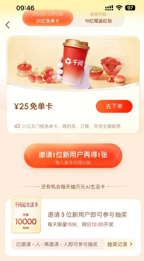今日千问APP活动页面显示,第一波免单活动时间为2月6日-2月12日,免单规则如下: