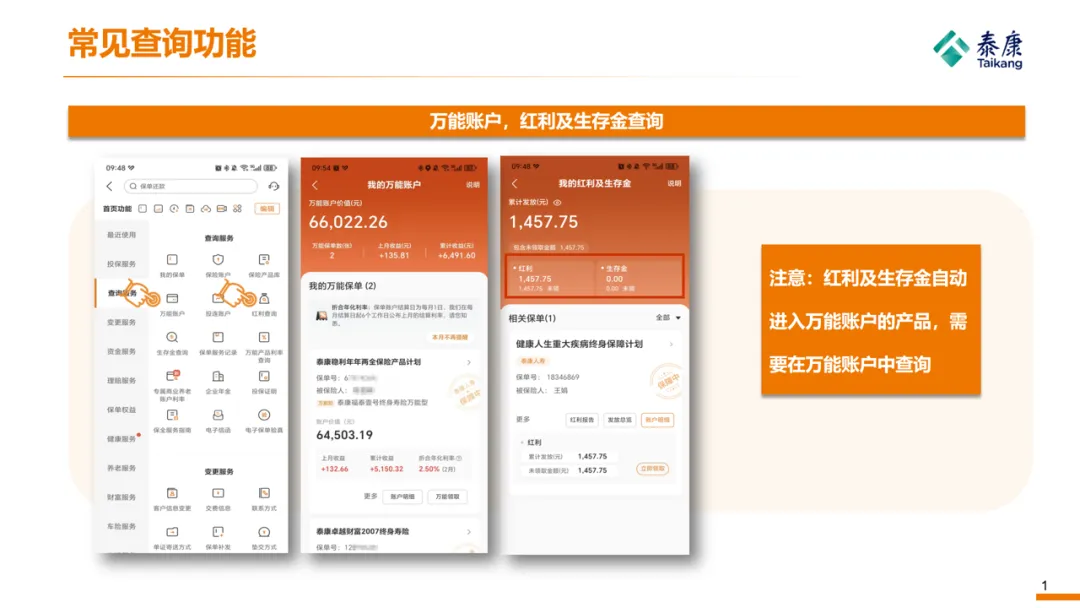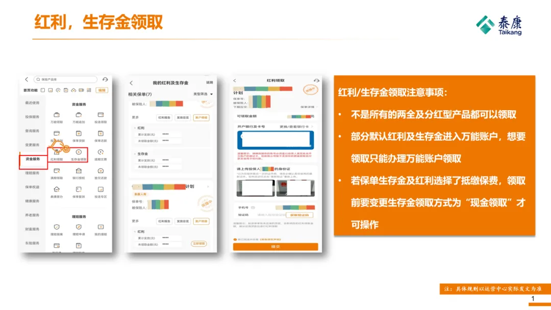 12:红利生存金领取时需要注意,续时所有的两全及分红后产品都可以领取,默认红利和生存金进入万能账户的,只能通过万能账户领取办理