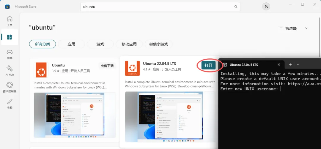 在微软应用商量中,很容易找到并安装 Ubuntu 的发行版,这里选择 Ubuntu 22.04.5 LTS 版本,安装后,点击打开,就进入的熟悉的 linux 命令窗口,首次会提示建立管理员账户,一不小心建立了一个名称为 ubuntu 用户。这时,在 Windows 中使用以下命令即可查看到已经安装的这个发行版。
