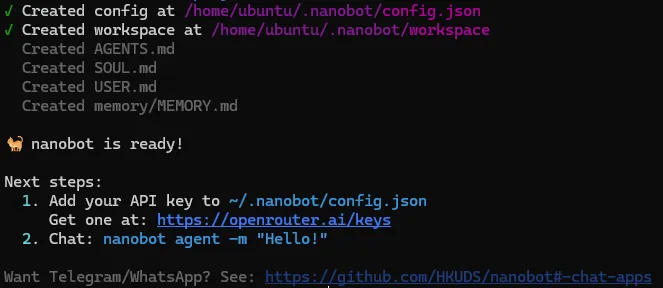 nanobot 是受 OpenClaw 启发的超轻量级个人 AI 助手,但代码量仅约 4,000 行,是尝试使用和学习的最佳选择。于是,在 Windows 的 WSL 中,使用源码方式进行发安装运行,并尝试改写代码来为下一步熟悉作准备。项目地址如下。https://github.com/HKUDS/nanobot在《Windows中使用Docker安装ChirpStack》中,提到了在 Windows 中安装 WSL 的方法,可作为参考。有了 WSL,就可以在 Windows 上安装 Linux 的各种发行版,这为 nanobot 的运行与调试提供了更适合的环境。