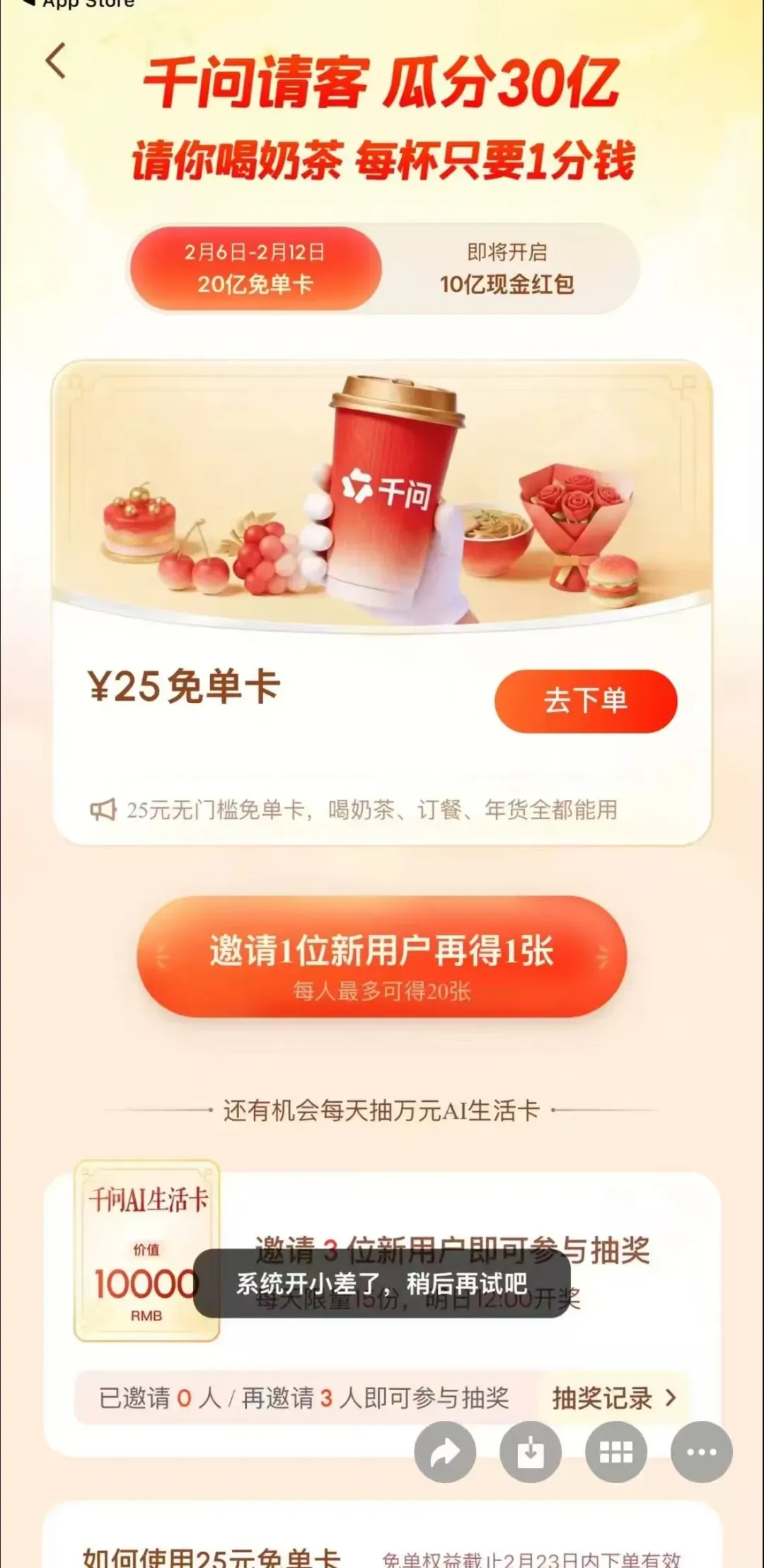 2月6日消息,今天千问App正式官宣《瓜分30亿,现在起用千问App免单喝奶茶》活动。此举拉开了阿里春节红包大战序幕,“春节30亿大免单”,连续七天邀请全国人民用AI一句话免单点奶茶成为千问App拿手戏。 但千问上线奶茶免单活动后,部分用户打开活动页面,发现 “千问请客” 页面无法点击,页面信息显示 “系统开小差了,稍后再试吧”。