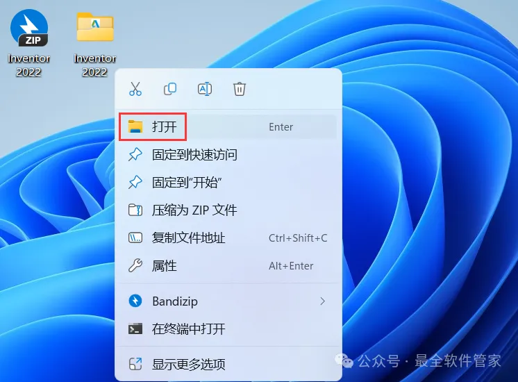 13、回到桌面,右键桌面上的【Inventor 2022软件图标】,点击【打开】