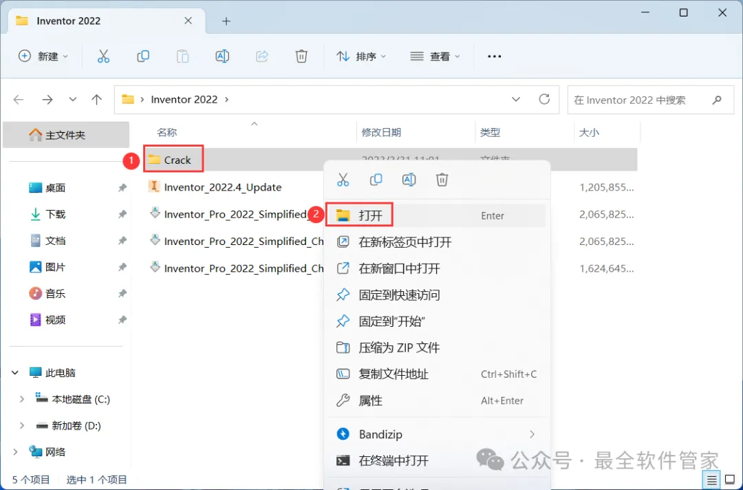 10、回到Inventor 2022文件夹,找到【Crack】文件夹,右键【打开】它