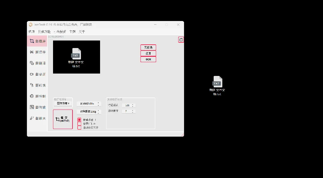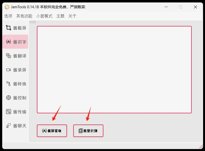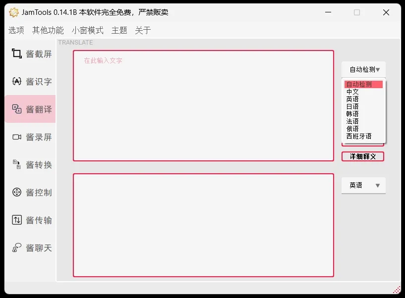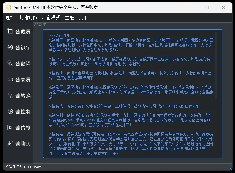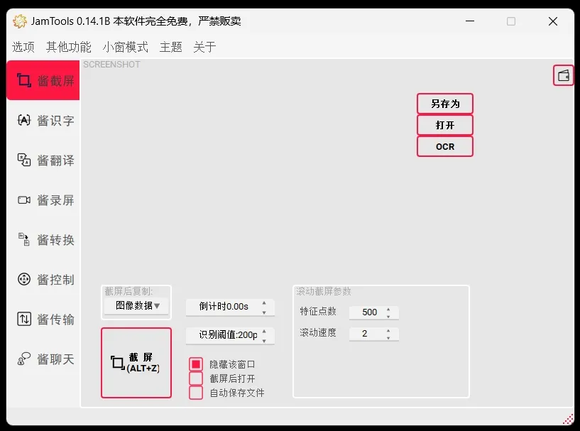 如上图所示,该软件对每个功能的命名也挺有意思:酱截屏、酱识字、酱翻译、酱录屏、酱转换、酱传输、酱聊天。