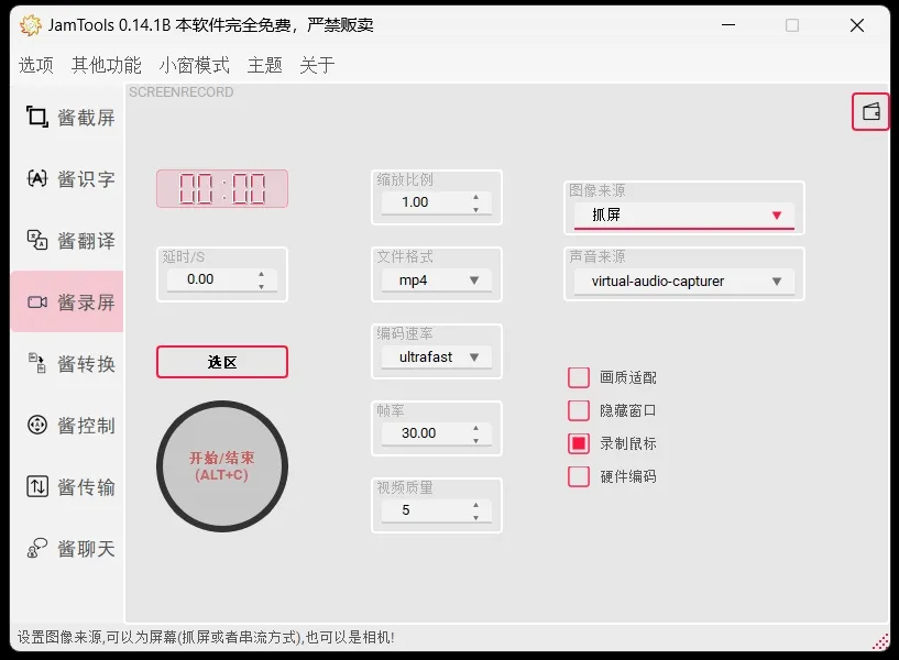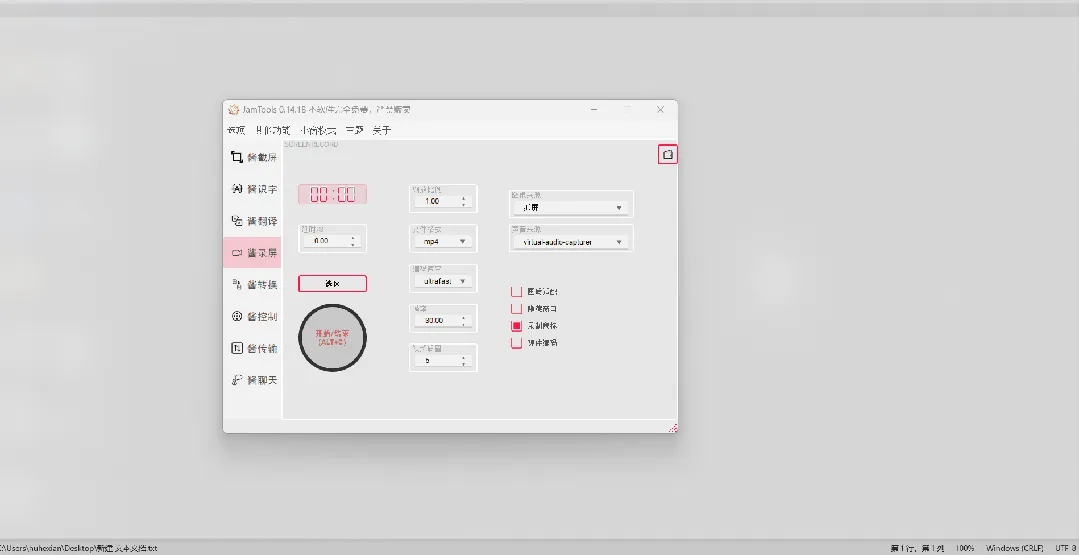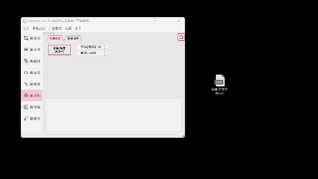 这个功能蛮实用,快捷键Alt+c,支持GIF等多种格式录制,可以自由选定录制区,还能自定义编码速率、帧率、视频质量以及声音源等。
