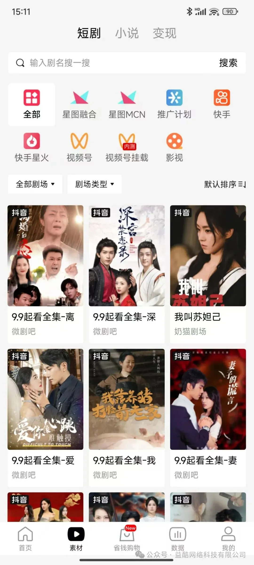 2. 选择模式:仅看剧赚钱可直接浏览首页短剧,完成每日任务;想推广变现,进入“素材库”,选择热度高、高转化的短剧,一键获取授权和素材(支持百度网盘下载)。