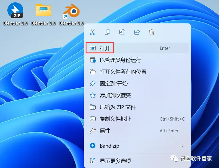 10、回到桌面,右键桌面上的【Blender 3.6软件图标】,点击【打开】