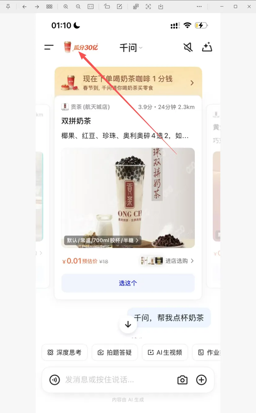 千问APP炸裂福利:0.1元奶茶薅羊毛攻略!首个联动淘宝闪购实现自动化的AI助手,不仅聪明好用,更带你一键白嫖!