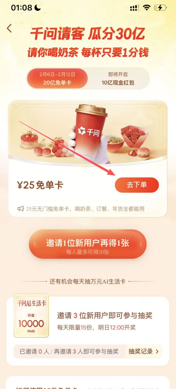 三、去下单(你也可以邀请你的好友一起白嫖哈哈。至于千问这个助手嵌入了自动化你们用不用是你们的事儿啦)