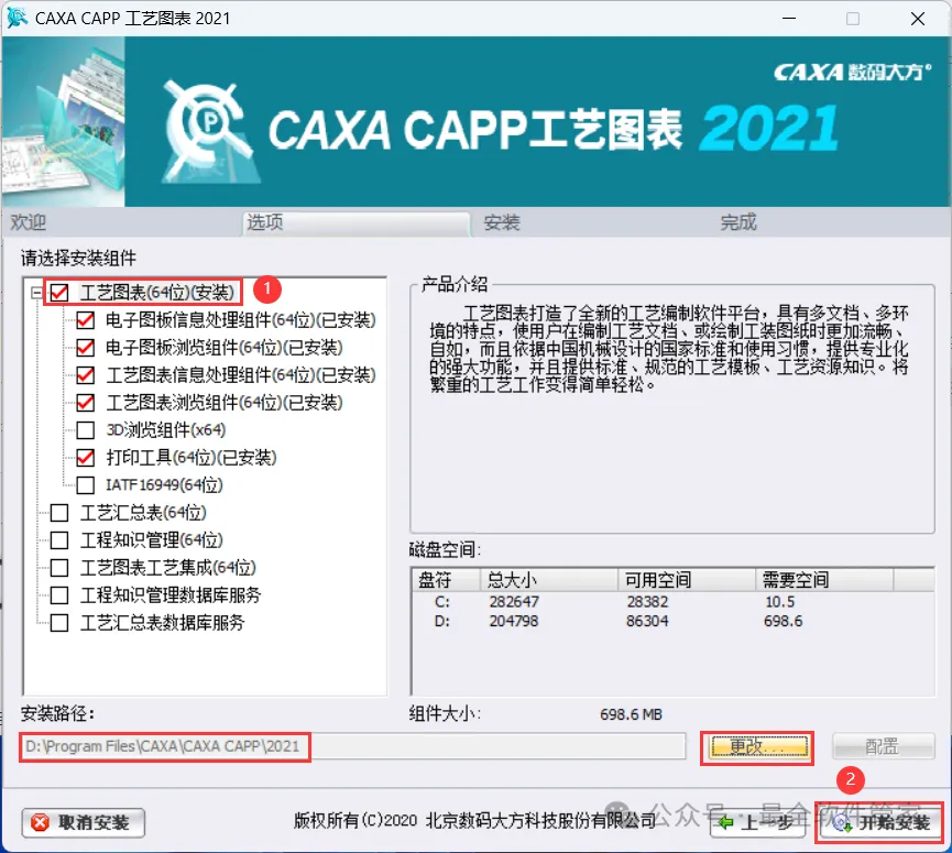 6、勾选需要安装的组件,软件默认安装在C盘,可自定义更改软件安装位置,这里小编选择安装在D盘;点击【开始安装】