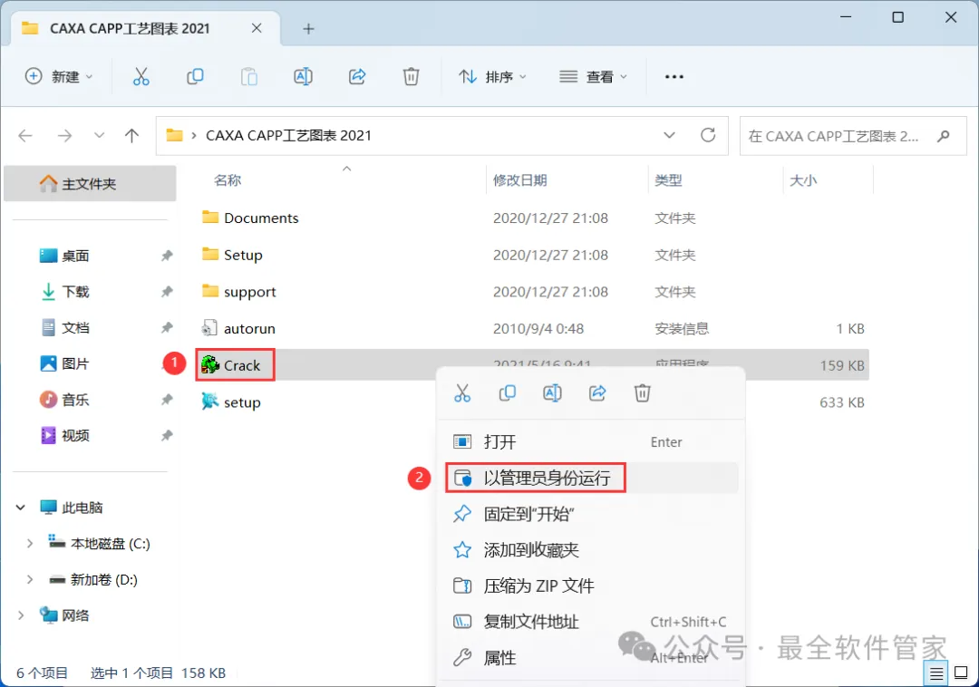 10、回到CAXA CAPP工艺图表 2021文件夹,找到【Crack】应用程序,右键选择【以管理员身份运行】它