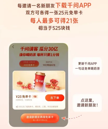 c)双方得卡:好友通过你的邀请链接 / 二维码下载并注册千问 App 后,你和好友各得 1 张 25 元免单卡。