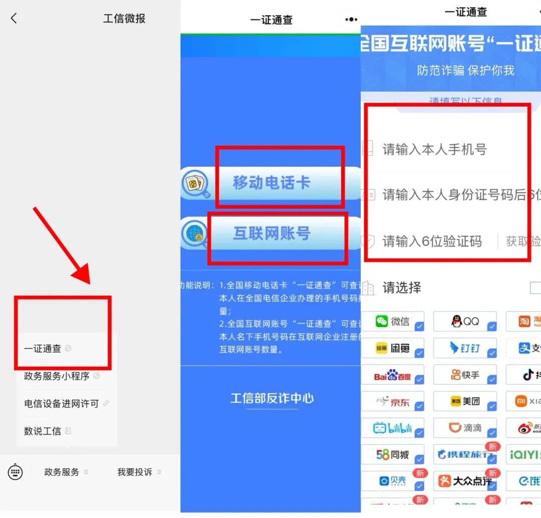 如何快速查询手机号关联的APP,清除不知情注册的网络账号? 你的名下有几张电话卡? 又关联多少互联网账号? 来这里“一站式”查询 ↓↓↓ 用户可以通过工业和信息化部政务微信公众号“工信微报”,点击“政府服务”按钮,选择“一证通查”,可查询本人名下手机号码关联的互联网账号数量和名下移动电话卡查询服务助力群众防范“不知情注册账号”“冒名办卡”等安全风险! 查询结果会通过短信的形式发送至用户手机。如用户对查询到的移动电话卡号或互联网账号结果有异议,可联系对应电信企业或互联网企业,查询明细信息,并按照相关攻略进行注销、解绑等操作。