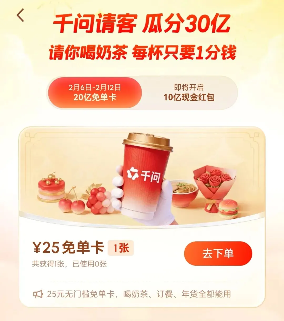 2月6日,大模型应用“千问”上线了“30亿大免单”活动,凭借“1分钱喝奶茶”的超低门槛和“邀请好友再获卡”的社交裂变机制,迅速在朋友圈和微信群掀起狂欢。活动上线仅5小时,奶茶订单量便惊人地突破了500万单,大量用户在社交媒体晒出0.01元的付款截图。这种“病毒式”的传播直接导致线下门店陷入瘫痪,奈雪、霸王茶姬等多家奶茶店因爆单不得不暂停接单,柜台前待取的奶茶堆积如山。