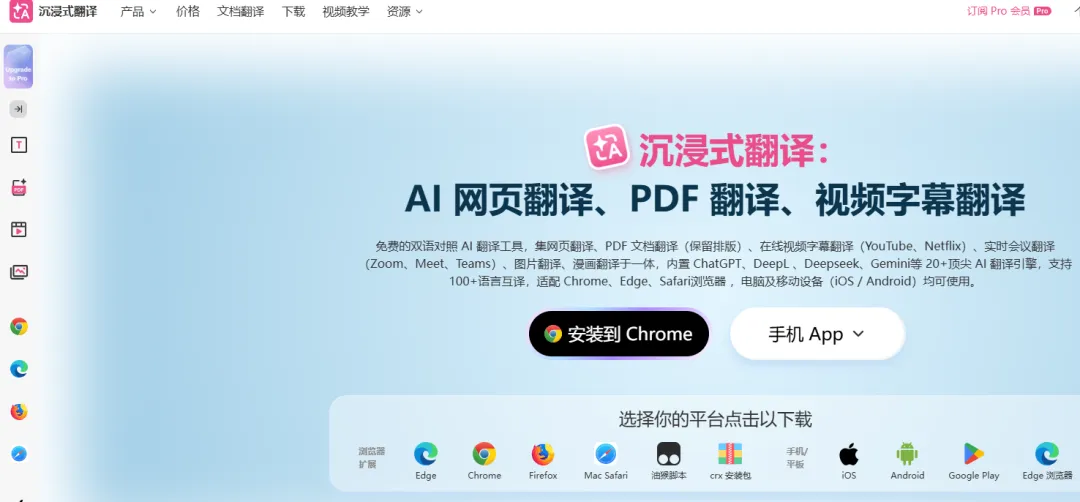 设置引擎: 安装后,点击插件图标。默认的谷歌/微软翻译已经很强,有条件的建议在“设置 -> 翻译服务”里接入 DeepL 或者 AI 模型。