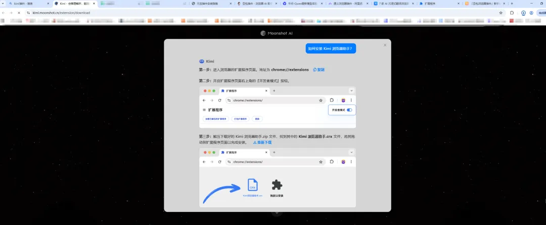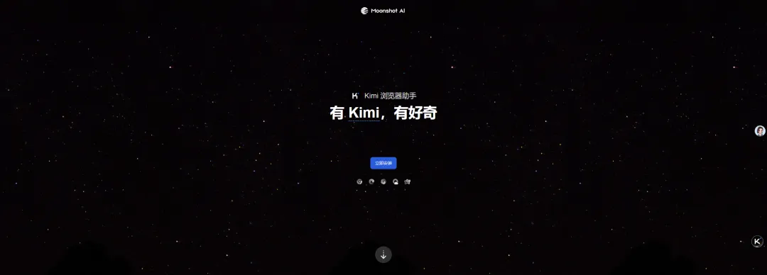 Kimi的安装页面采用科技感十足的星空黑背景,看起来很酷,但功能太有限了,不过浏览器的入口功能越来越少的时候,也许客户端更重要?