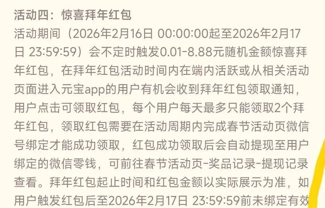 宝子们,春节羊毛来啦!元宝 APP「惊喜拜年红包」限时开启,人人可领,红包金额 0.01–8.88 元,直接提现微信零钱,不用凑门槛,这波闭眼冲!