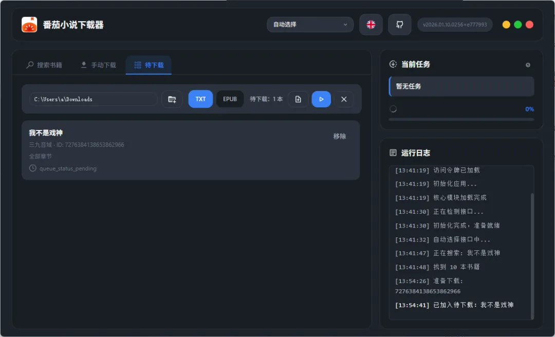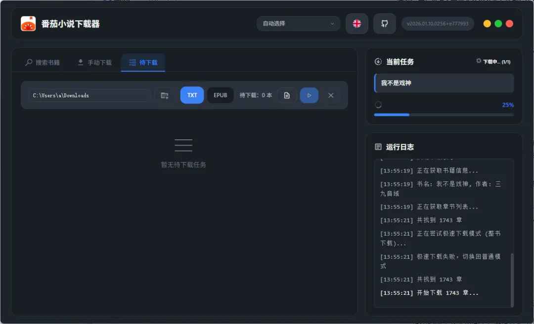 3. 选择格式,开始下载: 选择你想要的格式(EPUB/TXT/MP3),点击“开始下载”按钮。稍等片刻,一本完整的小说就会出现在你的指定文件夹里了!