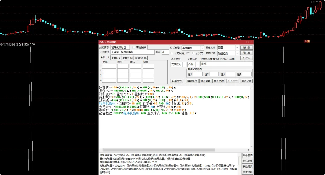 程序化指标:=饱和度>=88 AND 位置值>80 AND MA(持股线,12)<50;
