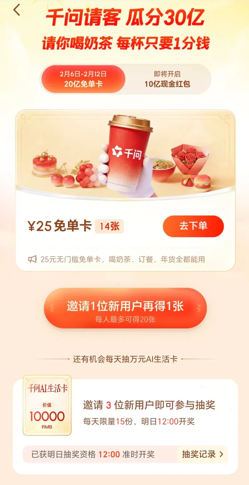 从2月6日开始,千问APP正式启动”春节30亿大免单”活动。