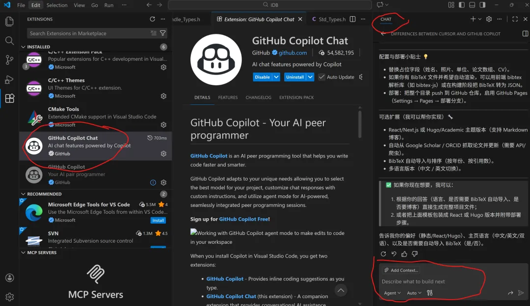 - AI Chat:可解释复杂算法(如深度搜索)、生成 Git 提交信息、排查内存泄漏等。可通过Ctrl+L打开聊天面板。