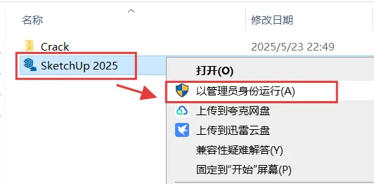 3.选中【SketchUp 2025】程序,鼠标右键点击【以管理员身份运行】。
