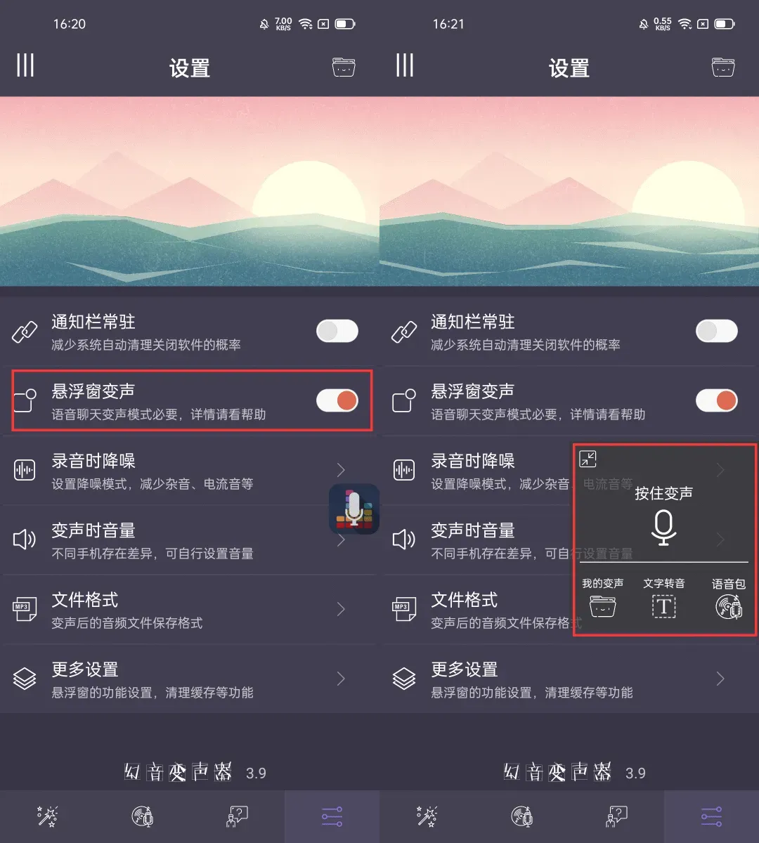 要使用这些语音包的话,也很简单,我们先把悬浮窗权限给【幻音变声器】,然后点开设置里的“悬浮窗变声”。