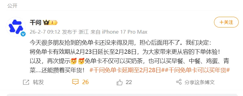 作为“春节30亿大免单”活动第一波,千问App活动页面显示,第一波活动时间为2月6日到2月12日。所有用户更新千问App后,都能获得一张25元无门槛免单卡,不但能免单喝奶茶,也能通过淘宝闪购买年货、点外卖。