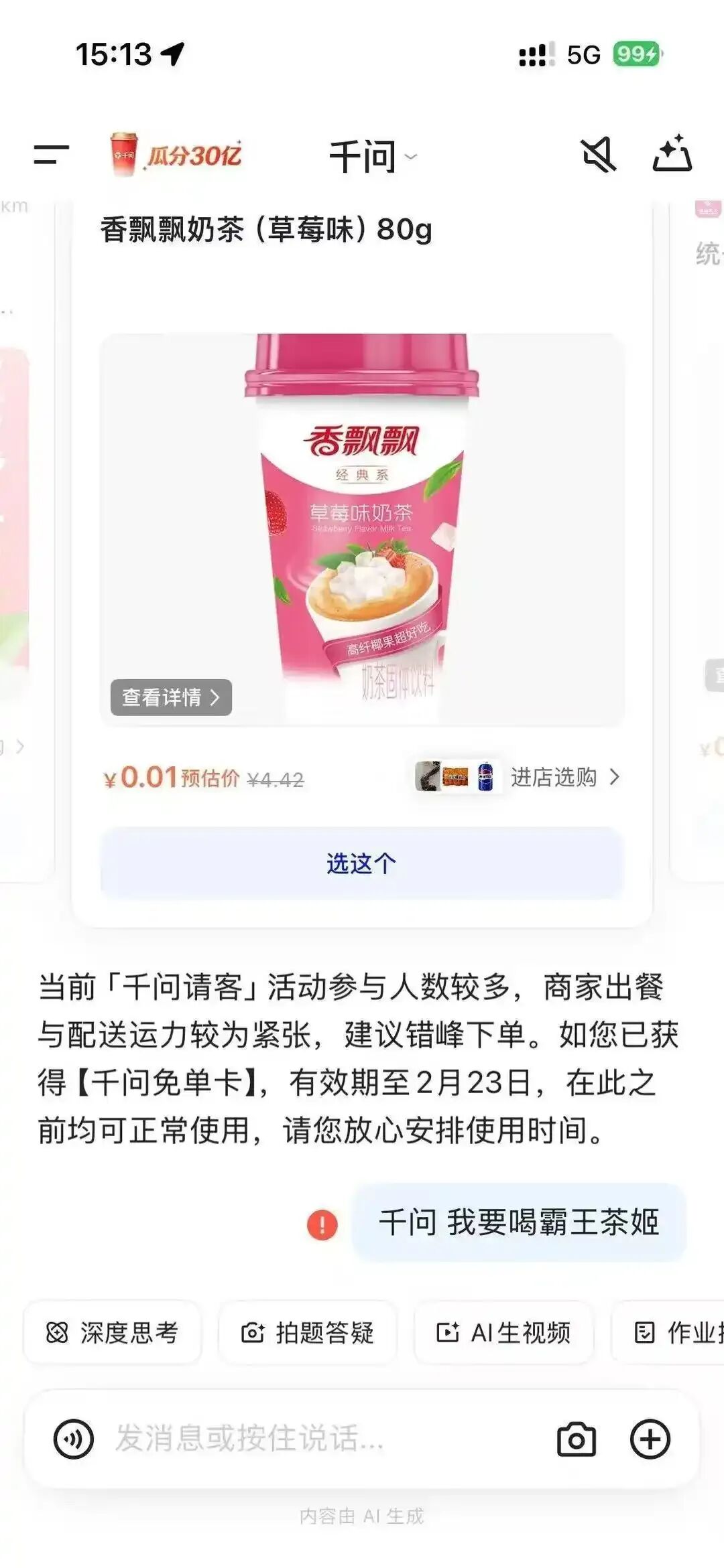 6日下午,李先生在社交平台发文称,“让千问请喝奶茶请了一天,结果页面推荐我买香飘飘,我还是不用它请我喝这个呀。”