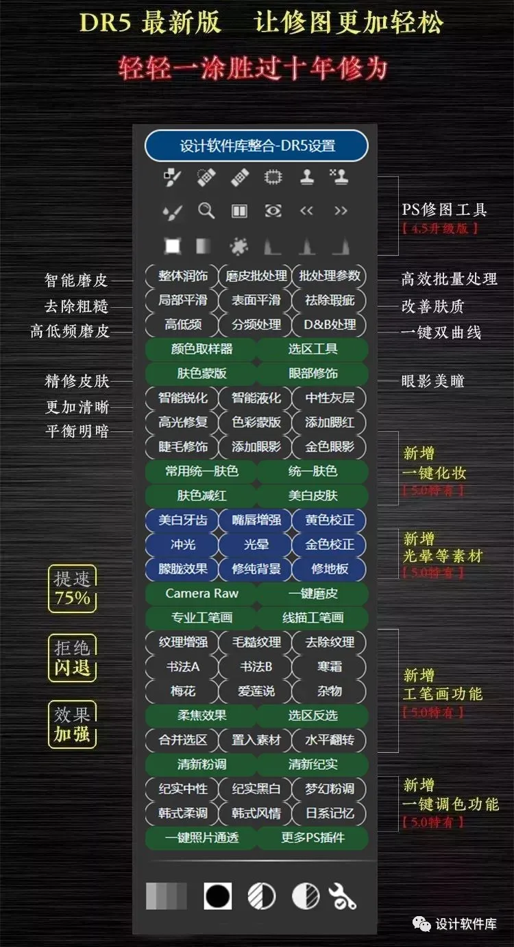 这次升级无论是在处理速度、功能、还是在效果上都比之前的旧版DR5有了大幅度的提升,更加智能了,而且使用面板中包含多种适用于人像修饰的功能,新增加了一键化妆、一键调色、工笔画、光晕素材等功能
