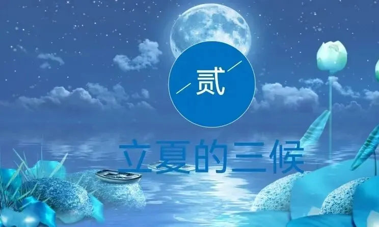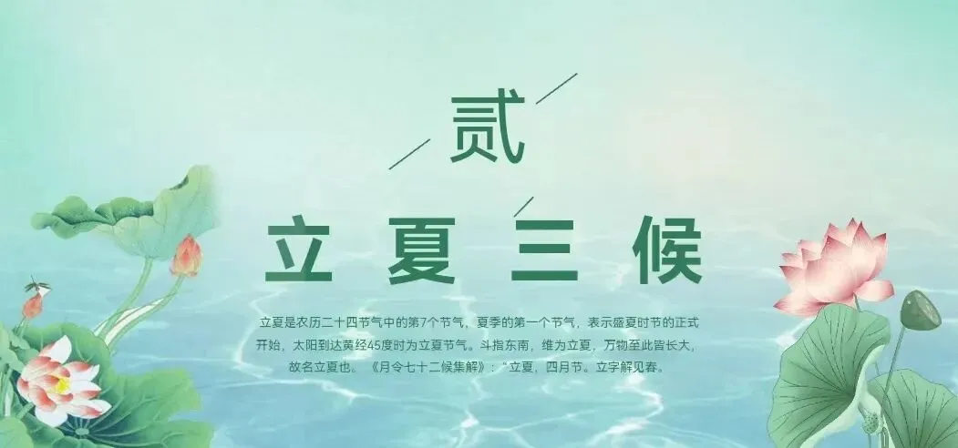 一候蝼蝈鸣:立夏后的第一五天,蝼蝈开始鸣叫。蝼蝈即蝼蛄,适宜温暖潮湿的环境,其鸣叫标志着夏天的气息逐渐浓厚。