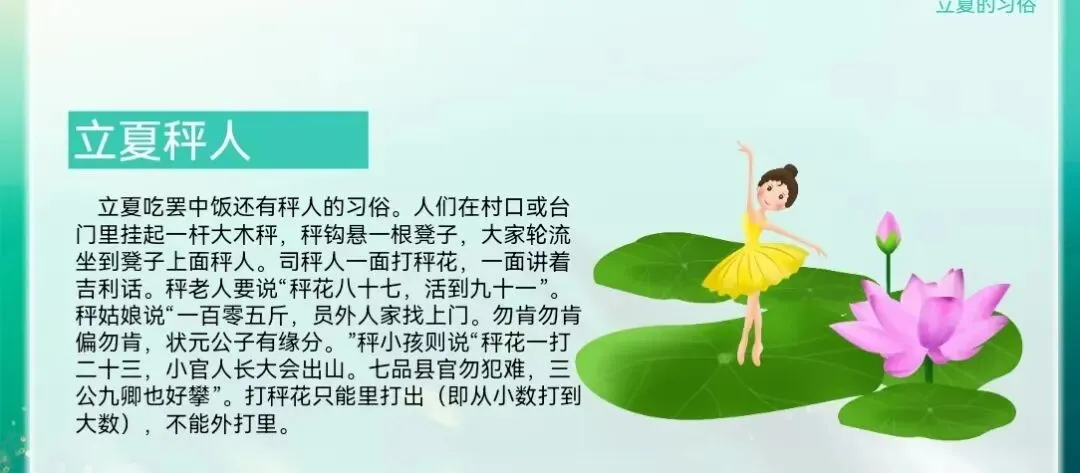 秤人:在立夏这天称体重,司秤人会说吉利话,祈求健康长寿,体现了对身体健康的关注和对生活的美好祝愿。