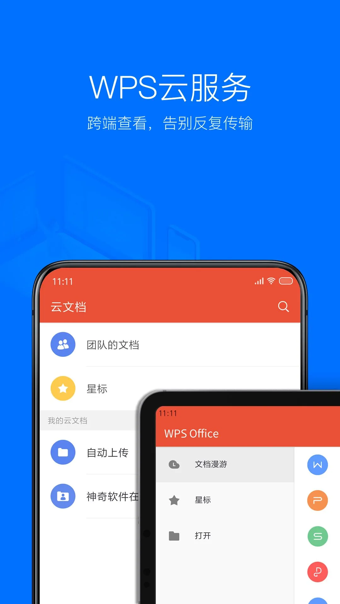 WPS Office 内置自动同步服务,这意味着你的文档可以在所有设备现身。通过登录账号来开启服务,你可以使用常用的QQ账号、WPS账号、小米账号或者微博账号登录。你在任何一部设备做出的更改都会出现在你所有的设备,甚至是正在编辑的文件。